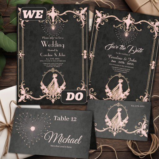 stijl lijst met ingewikkelde florale design in een zacht roze en gouden kleurenschema. Het lijst bevindt zich tegen een donkergrijze achtergrond en creëert een gevoel van elegantie en sophisticatie. De bovenkant van het lijst bevat een gestileerd bloemmotief met een stralend patroon, terwijl de onderkant een silhouet van een vrouw in een vloeiende jurk heeft.