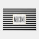 De grafische voordeurmat wordt gedaan in een zwart-wit horizontaal gestreepte patroon. Een wit decoratief tekstgebied, in het midden van de mat, heeft zwarte tekst klaar om zich te personaliseren. Wat een mooie manier om gasten bij je thuis te verwelkomen.