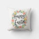 Deze prachtige gooipijp is voorzien van een waterverf die florale kreet in koraalroze en perzikkleurig, geel, groen en blauwgroen schildert. De moderne, met de hand geschreven typografie luidt "Happy Easter" in het zwart. De rug van de kussen bevat een patroon van weinig witte stippen over een passende lichte blauwgroen groene achtergrond.