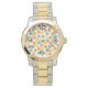 Dit man horloge heeft een geometrisch ontwerp van stippen in koraal, goud, en sage groen.