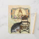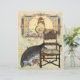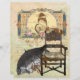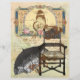 stoel met ingewikkeld Blue Label en zwarte kanten paraplu met Butterfly Script over. Goud en groen oud papier op achterzijde