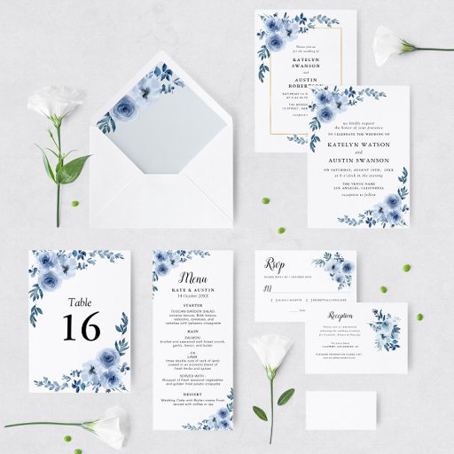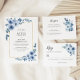 stoffige blauwe bruiloft bloemen RSVP kaart