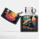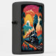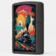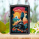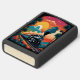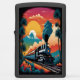 Een stoomlocomotief steekt bij zonsondergang door een weelderig tropisch landschap, met een vurige lucht en een torenhoge berg in de verte.