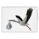 Klassieke weergave van een ooievaar tijdens de vlucht die een pasgeboren baby op witte achtergrond levert. Voeg je eigen slogan toe. Ideaal voor aankondigingen, uitnodigingen, briefkaarten, felicitaties en dankbetuigingen.