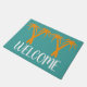Een strand met palmbomen Zomer thema welkomstmat met oranje palmbomen in een strandthema tegen een blauw aanpasbare gekleurde achtergrond met welkomstbord. Een huiselijke, strand Zomer vibe welkom deur mat perfect voor uw huis.
