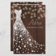 Witte bruine diamanten trouwjurk op een donkerbruine schuur met touwtjes met achtergrondverlichting, waardoor een eenvoudige moderne, elegante vrijgezellenfeest-advieskaart wordt gemaakt.