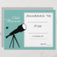 Een academische prijs voor een academisch diploma met een afbeelding voor het thema "telescoop wetenschappen", perfect voor het stimuleren van een jonge wetenschapper of astronomiestudent. Je kunt in je eigen details schrijven. Een geweldige bron voor elk type klaslokaalleraar.
