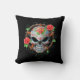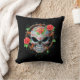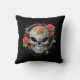 Dit ingewikkelde ontwerp van de suikerschedel bevindt zich boven op een ster met vijf punten die door een grote cirkel is omgeven. De schedel is verfraaid met wervelingen en stippen, alsmede met een groot roos en bladeren in het midden van de voorkop. De fijne wijnstokken weven hun weg rond de buitencirkel met aan beide zijden twee rozen. De schedel zit op een zuivere zwarte achtergrond die een verbluffend contrast creëer. Deze prachtige Dag van de Dode Suikerschedel maakt een agressief en stijlvol kussen.