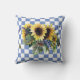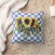 Het afbeelding van de zonnebloem werd gemaakt met waterverf, pen en inkt. De blauwe cheques maken een aantrekkelijke toevoeging aan een primitieve kamer.