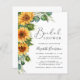 Deze budgetvriendelijke rustieke bruidsdoucheuitnodiging beschikt over waterverf boeketten van vrolijke zonnebloembloemen en eucalyptusgroen en elegante kalligrafiescripts.
