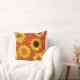 Orange throw pillow with sunflowers design. Big yellow flowers and little dots of yellow and brown cover this square, couch pillow.