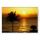 Foto's vangen de zon op die over de oceaan stijgt. Een statelijk handpalm zwaait in het zachte briesje. De stijgende zon geeft de oceaan een gouden gloed.