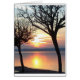 Een romantische zonsondergang op het meer, waarin deze oranje zon weergeeft tussen twee zwarte bomen.