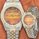 Schilderij "Sunset Plaza Marina 2584" Collectie Perfect voor dagelijks draag, kan dit zilveren en gouden tweekleurige horloge worden gepersonaliseerd om aan uw stijl te voldoen. Voeg jouw tekst toe om het aan te passen voor een geweldige stijlverklaring! Personaliseer op de productpagina of klik op de knop "Aanpassen" voor meer ontwerpopties. Het ontwerp gemaakt van mijn schilderij "Sunset Plaza Marina 2584" legt een levendige zonsondergang vast met strepen van sinaasappel en rode kleuren die de lucht vullen, omlijst door silhouetvegetatie en bloeiende planten op de voorgrond. De heldere tinten van de hemel contrasteren dramatisch met de donkere contouren van het landschap, waardoor een serene maar dramatische scène ontstaat. Bijpassende producten zijn beschikbaar in dit collectie.