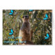 En vedette devant de grandes feuilles vertes, un suricate est en veille avec des papillons bleus.