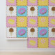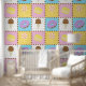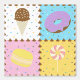 Tevreden je tand met dit kleurrijke patroon met smaakvolle taartjes zoals een chocolade-ijsje, een paarse bevroren chocolade donut, een citroengele macaron, en een roze en witte, gedraaide lolly, gescheiden door chocolade chips en omringd door regenboogsproeiers op vier helder gekleurde vierkanten.
