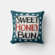 Een schattig typografisch voedselontwerp met de tekst "Sweet Honey Bun". Het is zwarte en rode tekst op een rechthoek met funky, speelse witte stippen eromheen, allemaal op een blauwgroen achtergrond.