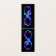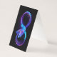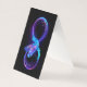Glowing, purple infinity symbole with flying, luminous, blue hummingbird on black background. Néon.