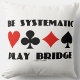 Laat anderen een dubbele take doen met een dosis bridge humor met dit brugstandskussen met de vier kaartpakken samen met het volgende geluidsbrugadvies: "Be Systematic Play Bridge". Gedenkwaardige bridge humor gezegde gooien kussen voor elke bridge club. Gedenkwaardige brug voor elke fanatieke brugspeler of brugleraar.