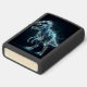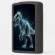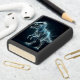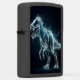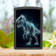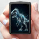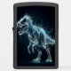 Gedetailleerde digitale weergave van een lichtgevende blauwe Tyrannosaurus Rex tegen een donkere achtergrond. De skeletstijl benadrukt zijn energievertoning