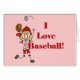 Le T-shirts de base-ball d'amour de la fille I, les tasses, les cartes, l'affranchissement, les autocollants, le magnet de base-ball, les sacs fourre-tout, les sweat - shirts à capuche, et d'autres articles d'habillement et de cadeau de base-ball comportant un bâton d'une chevelure blond figurent que joueur de baseball de fille dans un uniforme rouge et blanc de base-ball et texte rouge qui me lit "aiment le base-ball" !