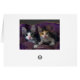 Een grijs en wit keukenblad met grote oren zit in een paars bed. Op de achterkant van de kaart wordt hij gesmokkeld met zijn zus van calico.