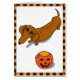 À l'intérieur de : "Festins obtenus ?" Un chien plein d'espoir de saucisse recherche d'un panier vide de sucrerie de citrouille, ses yeux parlant en faveur de vous pour le remplir d'os de halloweenie.