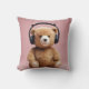 Schattigee bruine teddybeer die hoofdtelefoon draagt die op een roze achtergrond wordt geïsoleerd.