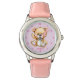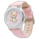 Een gepersonaliseerd horloge met een schattige teddybeer op een roze achtergrond.