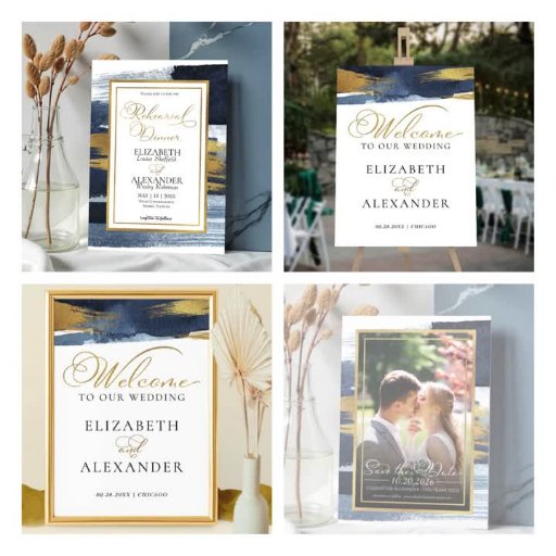 Plongez dans notre collection de Mariages Abstraits et laissez votre mariage briller. La collection est un mélange unique d'accents bleu marine et dorés, parfaitement jumelés à une aquarelle moderne. Ce Pinterest board vous offre la possibilité d'explorer des créations exquises et de vous inspirer pour votre journée spéciale.