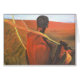 Man met een stok en boog kijkt terug over een bloeiend landschap. Heldere rode, sinaasappels, zuivere rijke geelten en donkere donkertjes. Contrast een pastelhemel.