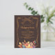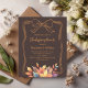 Een blauwe, donkerbruine achtergrond. Versierd met gedempte gekleurde herfstbladeren en een handgetekende boog. Personaliseer en voeg de partijgegevens toe. 1 vel = 1 uitnodiging bedrukt rand tot rand.