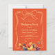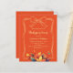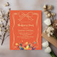 Een pompoen sinaasappel gekleurde achtergrond. Versierd met herfstbladeren en een handgetekende boog. Personaliseer en voeg de partijgegevens toe. 1 vel = 1 uitnodiging bedrukt rand tot rand.