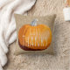 Deze vakantiepieltje is voorzien van een pompoen oranje pompoen die klaar zijn voor de oogst en de woorden "geef bedankt" in wit. De achtergrond is een faux burlap/woven patroondruk in kleurtinten van bruin, vergelijkbaar met een graanzak.
