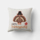 Pillow heeft een schattige Thanksgiving kalkoen aan beide zijden, die een pelgrim-pet met de woorden 'Happy Thanksgiving' in een leuk bruin en oranje script bovenop een traditionele gedempt-witte textielachtergrond doneert.