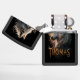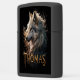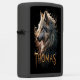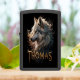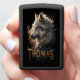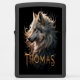 Een majestueuze wolf met vloeiende vacht en doordringende gouden ogen. De naam van de wolf, Thomas, is geschreven in elegante gouden letters onder zijn hoofd.