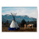 Een afbeelding van een Native American en zijn paard bij een tipi. Sneeuw heeft zich op de hogere hellingen van de bergen op de achtergrond gestabiliseerd.
