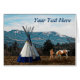 Een afbeelding van een Native American en zijn paard bij een tipi. Sneeuw heeft zich op de hogere hellingen van de bergen op de achtergrond gestabiliseerd.
