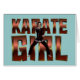 Heldere rode tekst en een karate meid in de pose. T-shirts, sweatshirts, mokken, posters en andere cadeautjes voor de vrouw van de vechtsport op alle niveaus. Kleurrijk gereedschap voor de karaatinstructeur, student, zwarte gordel of ventilator.