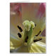 Inscription intérieure (peut être modifiée ou supprimée) : "Abeille réceptive... Vous ne savez jamais qui peut passer par là !" Entourés d'étamines polliniques, les stigmates (récepteurs polliniques) d'une tulipe de perroquet sont prêts à recevoir du pollen de l'insecte visiteur suivant.