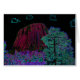 Een rode neongloed accentueert de verticale kolommen van igneusrots, die de groeven op het gezicht van de toren benadrukken. Een Ponderosa-pijnboom, met zijn zwarte schors geschetst met groene bladeren en blauwe gloeiende randen, staat hoog op de voorgrond, waardoor het contrast wordt vergroot tot zowel de toren als de zwarte hemel. Aqua gekleurde wolken zweven in de lucht. De rockpool aan de basis van de toren wordt gemarkeerd in magenta en paars. Devils Tower National Monument bevindt zich in de Black Hills of Noordoost Wyoming.