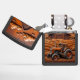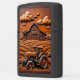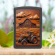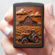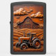 This lighter features a high-relief farm scene with a large, antique orange and black tractor in the foreground. The background shows a tall, rustic barn and rolling fields of crops under a brown-orange sky with textured clouds. The entire image has a deeply dimensional, monochrome brown and orange palette. The entire background landscape has a luxurious, soft-leather look. This artwork highlights the simple, yet profound acts of comfort and support provided by farming professionals, symbolizing warmth and peace. The highest quality print and artwork used on the surface is so exceptional it creates a stunningly realistic tactile illusion; you could easily mistake the textures for genuine leather. The entire design is set on a matte black lighter casing. The design may look real due to the high detail in the artwork.