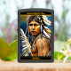Een trotse inheemse Indiase krijger staat hoog, versierd met kleurrijke veren en ingewikkelde sieraden, met erfgoed en kracht, omringd door een levendige, natuurlijke achtergrond bij schemering. OPMERKING Als u tekst- of randkleuren wilt wijzigen, gebruikt u het gereedschap Bewerken met het ontwerpgereedschap