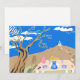 Original hand drawn illustration of Mediterranean afternoon with wine and coffee scenery, travel keepsake decor for backpackers. travelers and slow living lovers. Homely scenery with table set under an olive tree with a small chapel on a hill in the background on a sunny day with blue sky. Great as a kitchen decor.