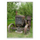 Een geroosterde trekker van antiek boerderij wordt op de voorpagina geparkeerd als een grasversiering tussen appelbomen op een fruitstand en boomgaard in het centrum van Keremeos, British Columbia Canada.