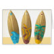 Un design de trois planches de surf en bois rétro debout ensemble sur le sable. Les dessins des planches de surf comprennent des vagues bleues, des dauphins et des palmiers. Ce design est cool, branché et parfait pour les amateurs de la plage, de l'été et du style de vie surf.