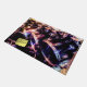 Het kunstwerk op deze deurmat is een originele foto van ZoeSPEAK van een drumstel. De glanzende zwarte drums met hun zilveren velgen weerspiegelen de kleuren van de lichten in de studio, blues, rood en groen. Cymbals boven de drums wachten om te worden geslagen. Er is een optionele gele post it sticker met tekst die luidt "Welkom". Dit is ingesteld voor u om te personaliseren of te verwijderen als u dat wilt.