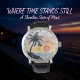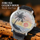 This artistic wall clock showcases a serene tropical scene with a graceful palm tree silhouetted against a vibrant sunset over the ocean. Its decorative and colorful design, with a relaxing vibe, makes it ideal home décor. This nature-inspired timepiece captures a tranquil beach view, bringing a touch of summer vibes and coastal theme to any room.