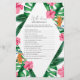 Tropical Palms Waterverf Bruidsdouche uitnodiging. Het design heeft een waterverf boeket van klassiek strandbloemengroen en -waterverven, waaronder blush pink hibiscus, sinaasappel en blauw paradijsvogeltje, groen groen groen en donkergroen palmblad.