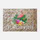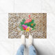 Een roze flamingo, tropische bloemen en bladerdeurmat is geweldig voor je thuis of een cadeau voor een nieuwe huiseigenaar die gepersonaliseerd is met je familienaam op een houten afdrukpatroon. (Niet echt hout, het is een afbeelding in volledige kleur.)